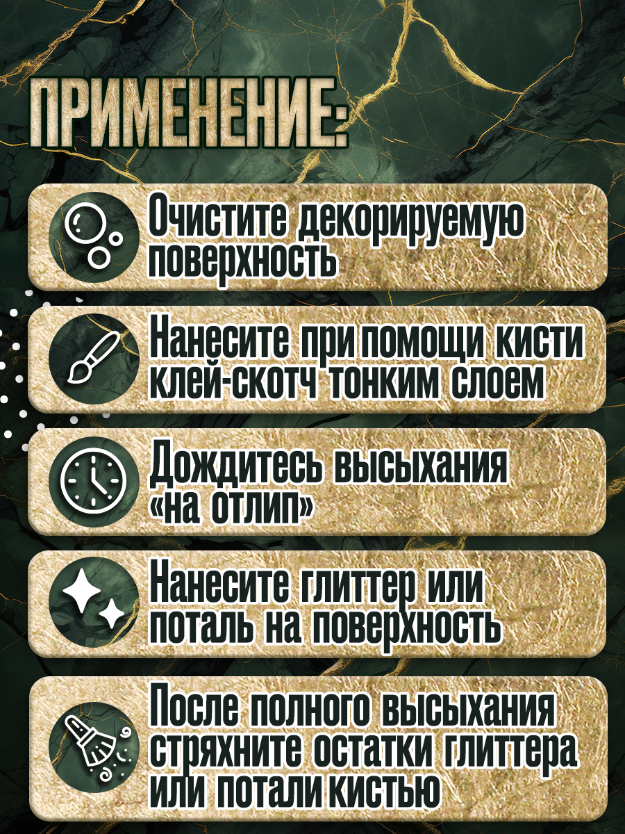 Применение: очистите декорируемую поверхность от грязи и пыли. Нанесите кистью тонким слоем клей-скотч, дождитесь высыхания «на отлип» и нанесите глиттер или поталь на поверхность. Дождитесь полного высыхания, снимите излишки потали или глиттера сухой кистью.