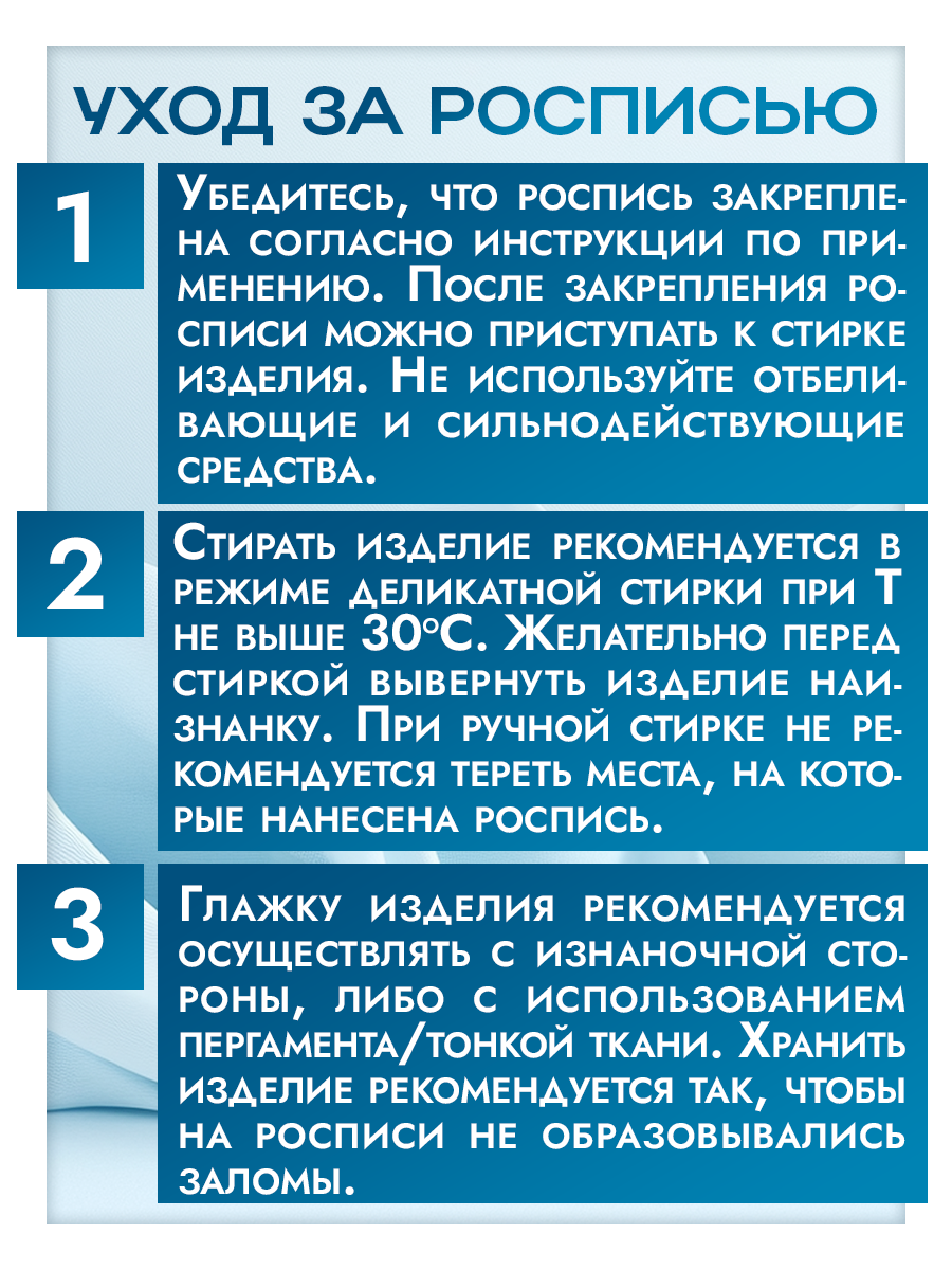 Правила ухода за окрашенным изделием: разрешена ручная стирка; деликатная стирка в стиральной машинке до 30 градусов (желательно при деликатной стирке выворачивать на изнанку вещь). Запрещено использовать отбеливающие средства