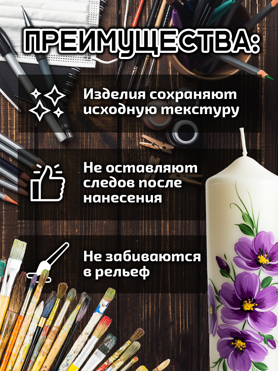 Этот уникальный продукт позволит создать потрясающие эффекты на ваших изделиях, подчеркнув индивидуальность каждого творения благодаря краске для гипса и свечей. Покрытые этими красками свечи, гипс и другие изделия сохраняют исходную текстуру, не забиваясь в рельеф, не оставляют следов после нанесения.
