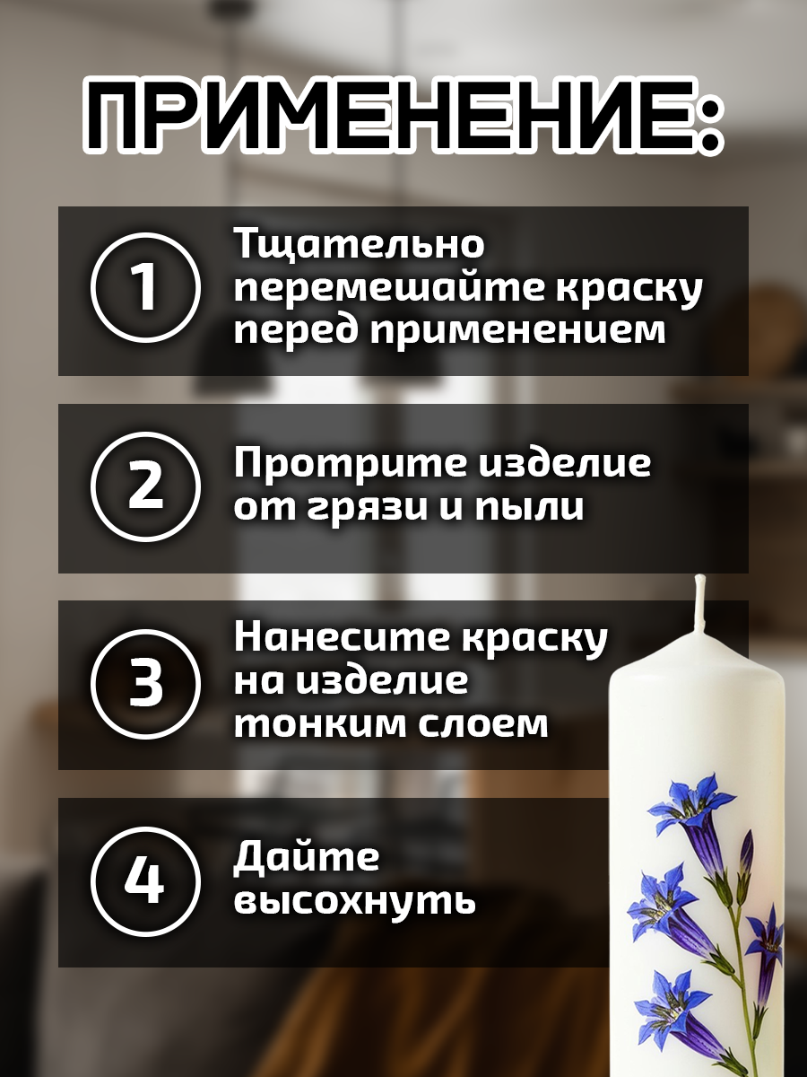 Подготовка поверхности: перед использованием требуется очистить поверхность от грязи и пыли. Цвет подходит для любой поверхности: гипс, свечи, дерево, холст, бумага.