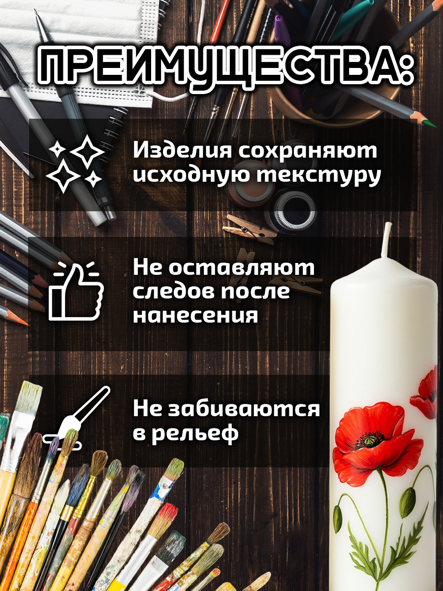 Этот уникальный продукт позволит создать потрясающие эффекты на ваших изделиях, подчеркнув индивидуальность каждого творения благодаря краске для гипса и свечей. Покрытые этими красками свечи, гипс и другие изделия сохраняют исходную текстуру, не забиваясь в рельеф, не оставляют следов после нанесения.