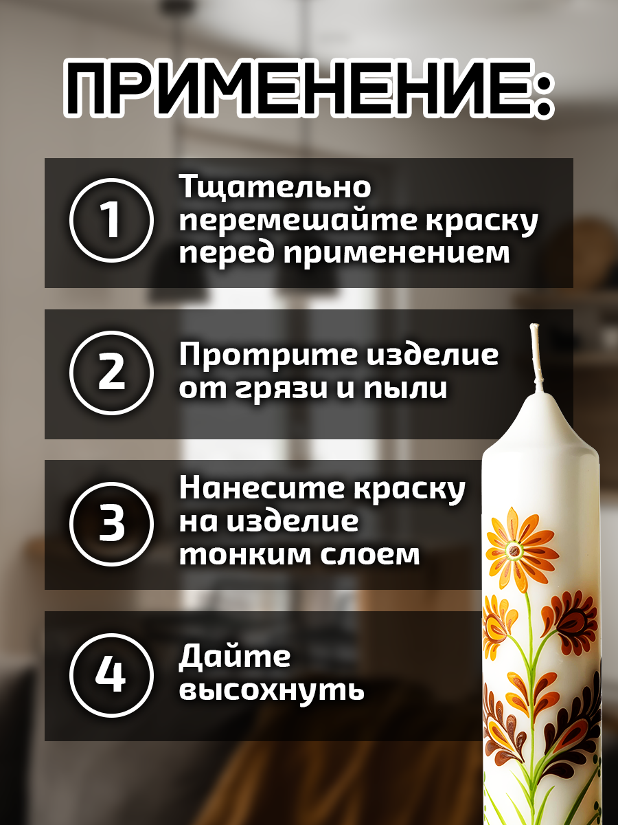 Подготовка поверхности: перед использованием требуется очистить поверхность от грязи и пыли. Цвет подходит для любой поверхности: гипс, свечи, дерево, холст, бумага.