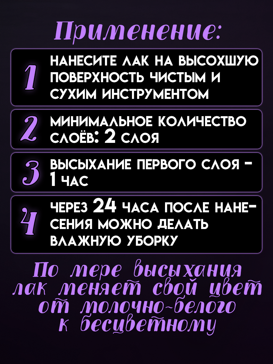 Применение: Лак для гипса следует наносить на чистую и сухую поверхность в два слоя. Время высыхания первого слоя - 1 час, полное высыхание - 24 часа.