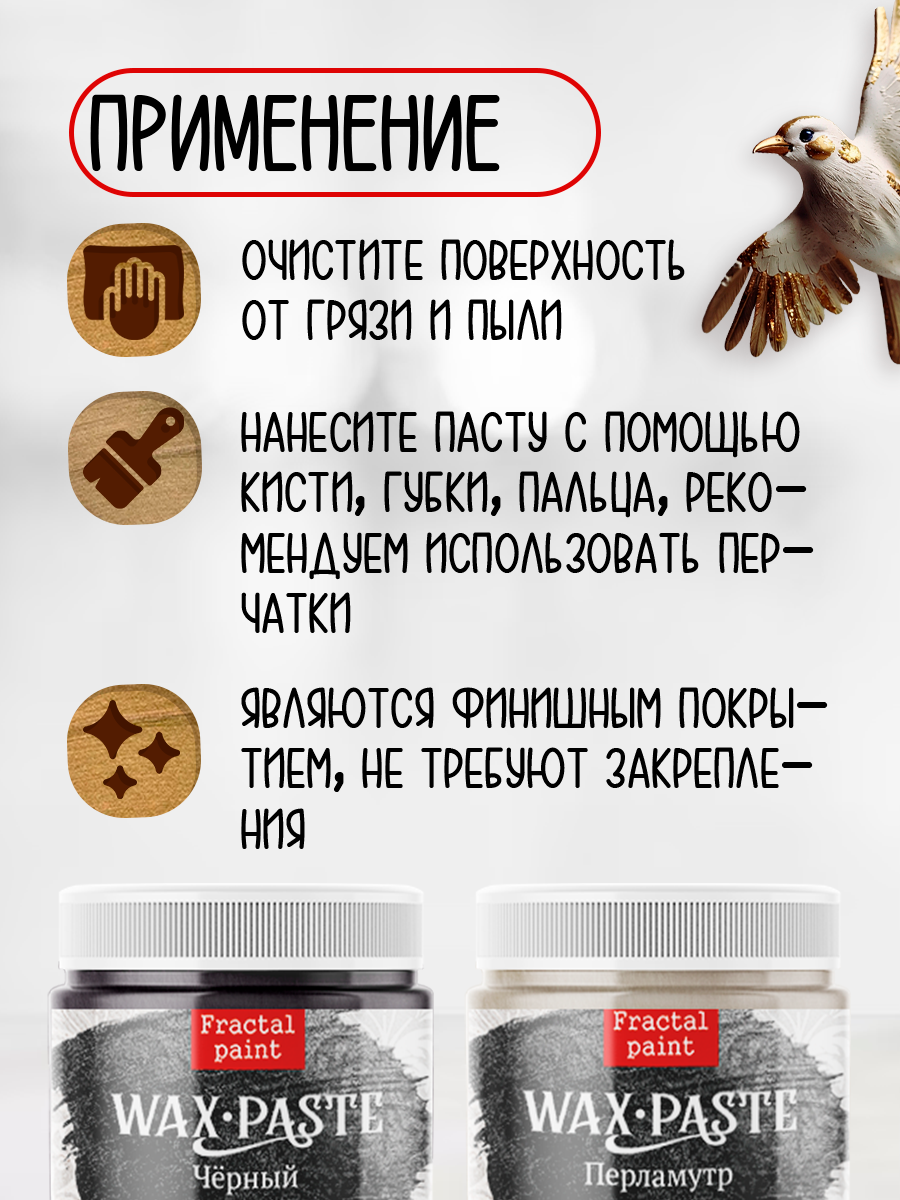 Применение: восковую патинирующую пасту наносят с помощью пальца, губки, кисти или кусочка ткани на сухую поверхность.
