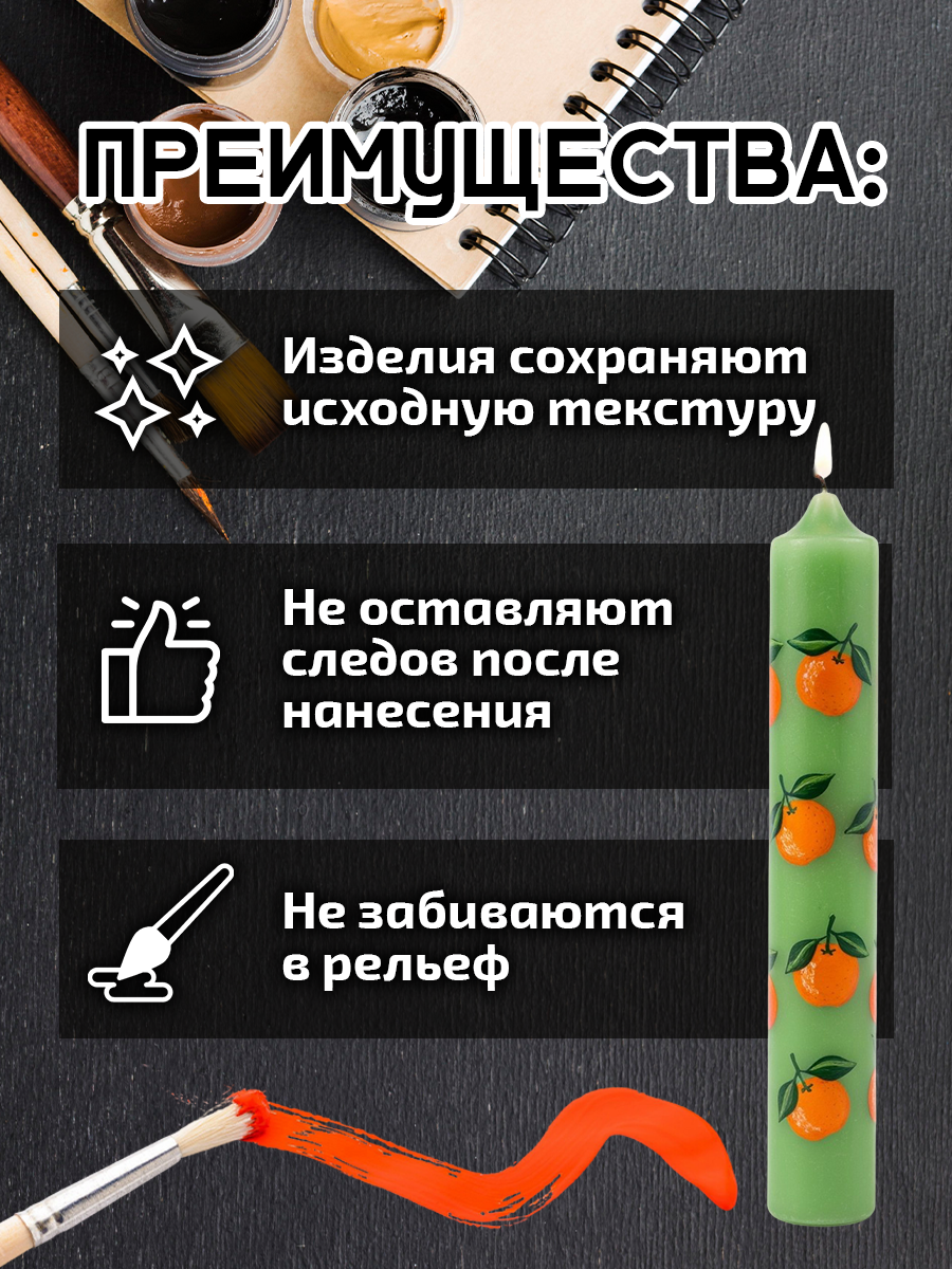 Этот уникальный продукт позволит создать потрясающие эффекты на ваших изделиях, подчеркнув индивидуальность каждого творения благодаря краске для гипса и свечей. Покрытые этими красками свечи, гипс и другие изделия сохраняют исходную текстуру, не забиваясь в рельеф, не оставляют следов после нанесения.
