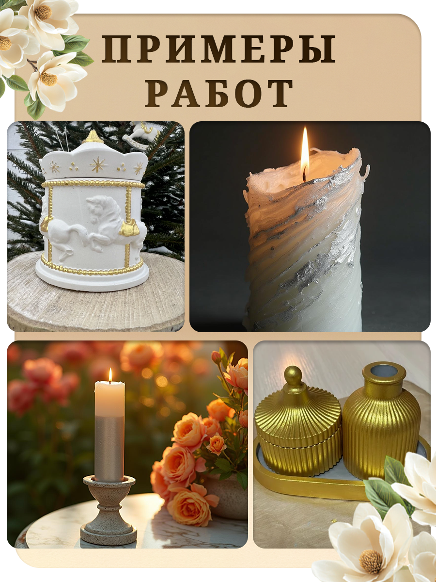 - Эффект металлического блеска на свечах и гипсе: придает изделиям роскошный вид, идеально подходит для праздничных украшений и эксклюзивных подарков.