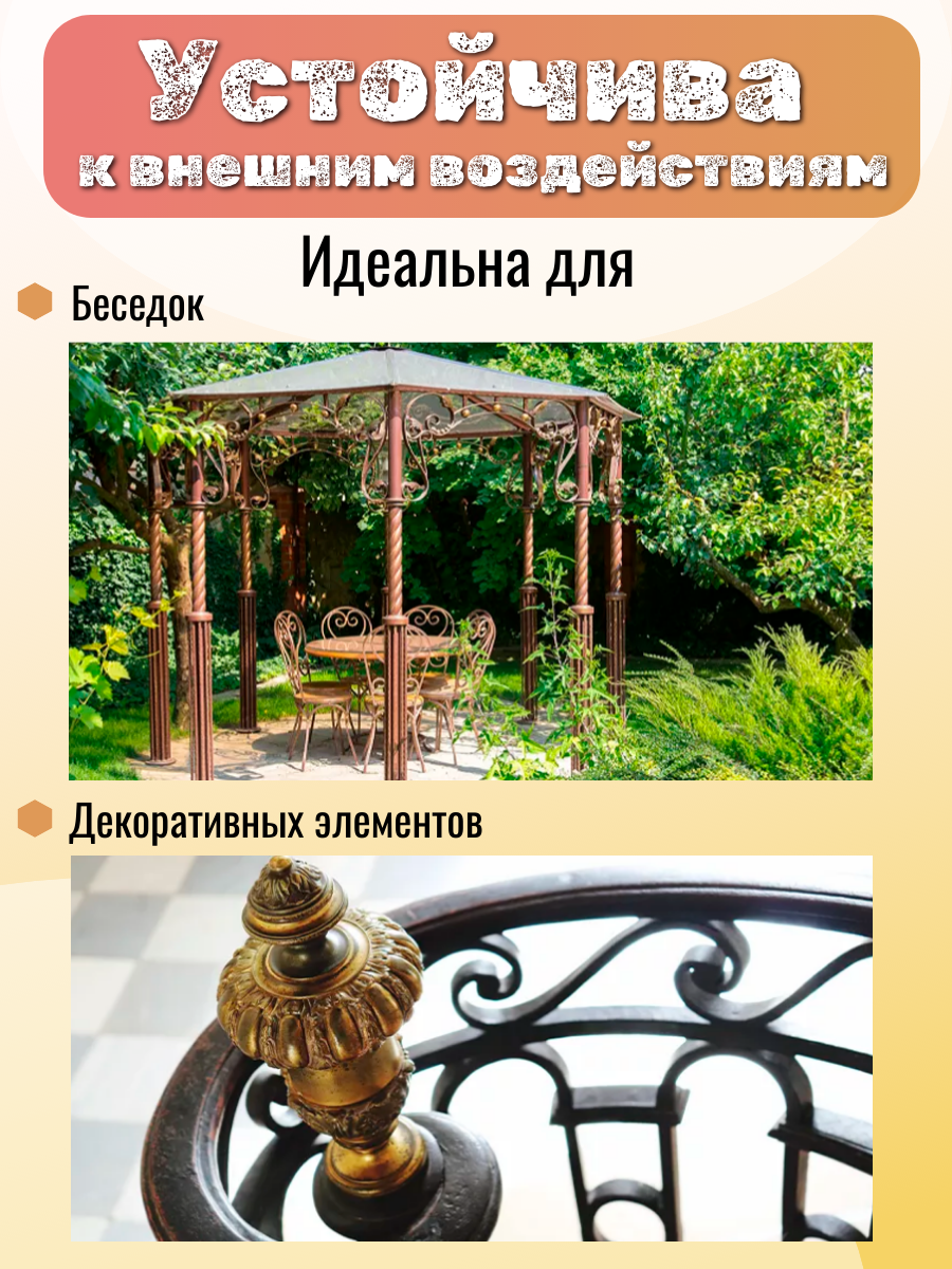 Краска Золото по металлу - это уникальное средство, способное превратить обычную металлическую поверхность в произведение искусства. Патина, нанесенная с помощью этой краски для наружных работ, придает изделиям элегантный и роскошный вид, богатым золотым оттенком. Выбирая патину для металла, вы открываете для себя мир творчества и возможности преображать свои предметы интерьера. Краска медь прекрасно подходит для наружных работ, обеспечивая надежную защиту от воздействия внешних факторов и сохраняя свою яркость долгое время.