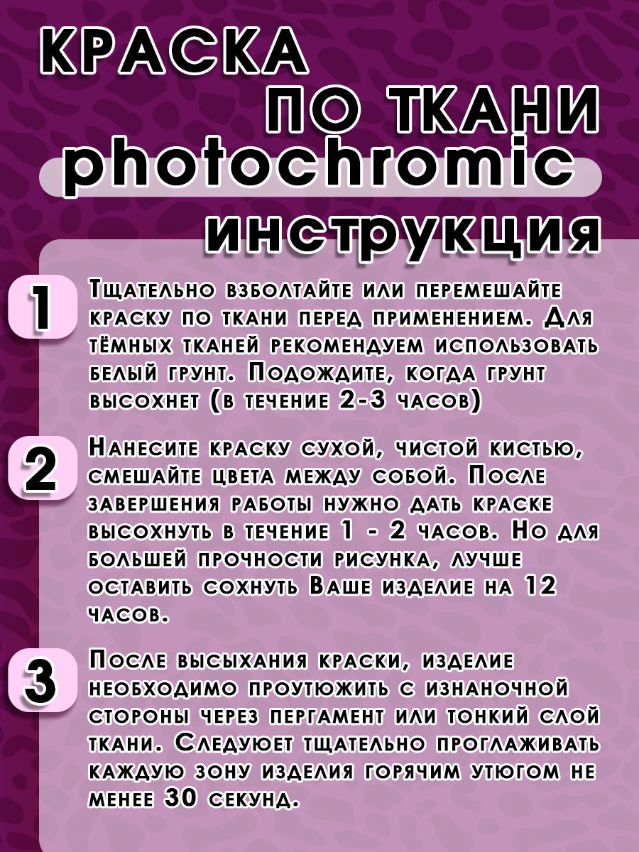 Светочувствительная фотохромная краска по ткани входит в серию «Photochromic», которая бесцветная на вид, но под воздействием солнечных лучей или иного источника света меняет цвет. Чем дольше и интенсивнее воздействие света, тем насыщеннее становится цвет. Подходит для нанесения на синтетические ткани. Обратный переход в бесцветный оттенок происходит самопроизвольно через 5-20 минут. Краски акриловые краски / краска для ткани / краска для росписи ткани / краски акриловые / акриловая краска / краски по ткани / краски для ткани / краска акриловая / краска для ткани черная / акриловые краски по ткани / краска по ткани / акриловые краски набор / краска акриловая белая / акриловая краска белая / акрил по ткани / акриловая краска для ткани / набор акриловых красок /набор красок по ткани / акрил для ткани / акриловые краски для ткани / краски для одежды / краски для обуви/ краска для джинсовок/краски для росписи футболок/