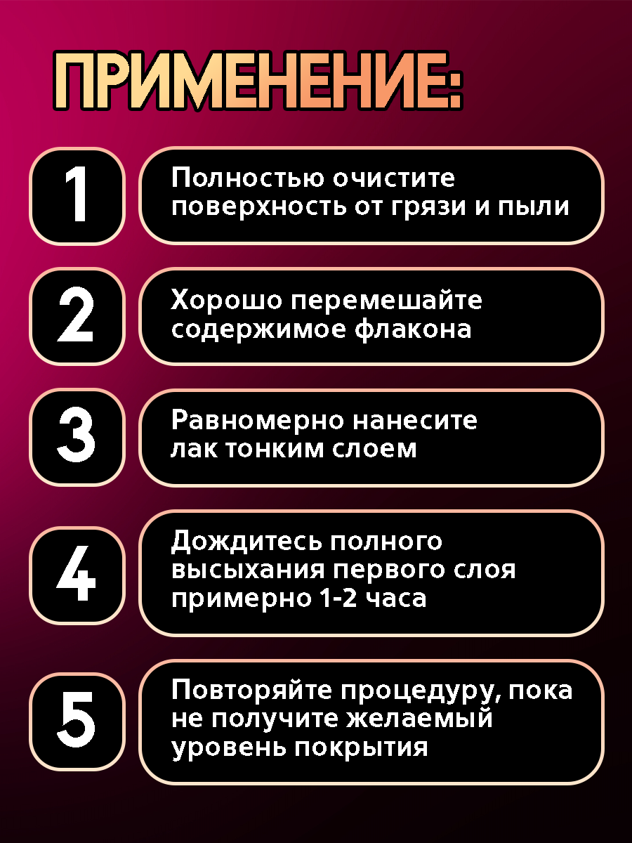 Перед использованием тщательно взболтать флакон в течение 30–40 секунд. Набирать небольшое количество лака, растушевывать тонким равномерным слоем. Избегать повторных проходов по подсыхающему покрытию.