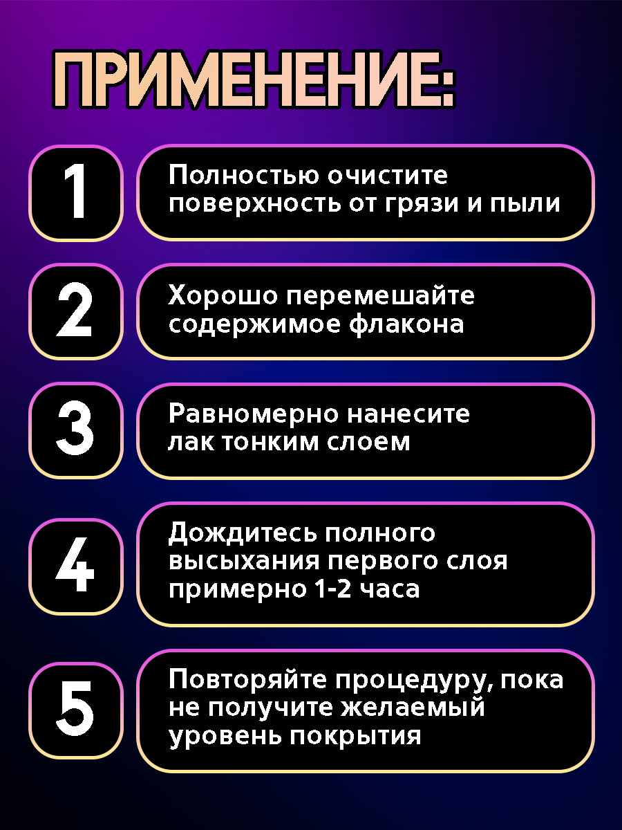 Перед использованием тщательно взболтать флакон в течение 30–40 секунд. Набирать небольшое количество лака, растушевывать тонким равномерным слоем. Избегать повторных проходов по подсыхающему покрытию.