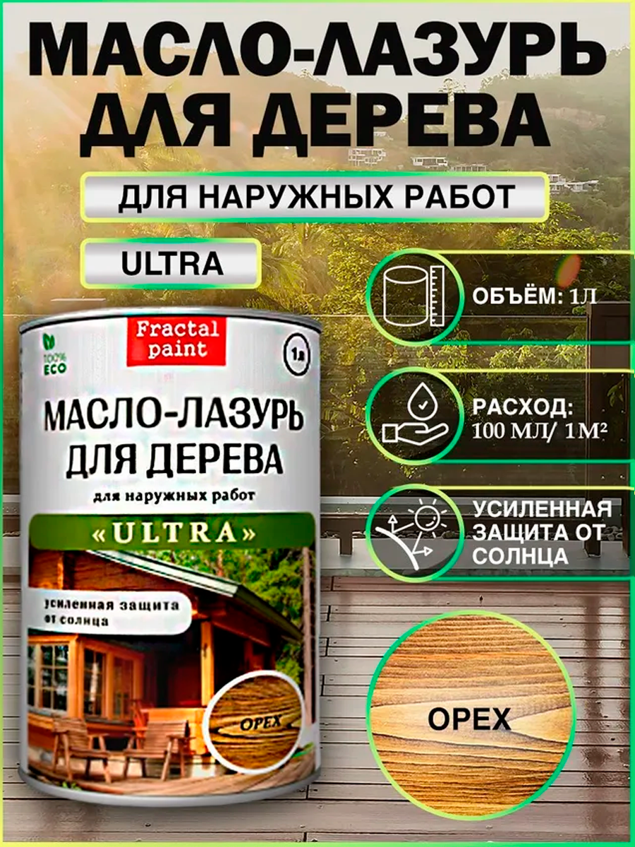 Пропитка для дерева «Масло-лазурь «УЛЬТРА» предназначена для наружных работ. Разработана для быстрой и эффективной защиты древесины от грибка, воды и ультрафиолета. Содержит натуральное льняное масло, воск, противогрибковые добавки, а также пигменты и специальные вещества для защиты от ультрафиолета. Масло подчеркивает красоту натурального дерева, проявляет текстуру и усиливает рисунок древесины. Воск защищает деревянные поверхности от атмосферных воздействий (дождь, снег). Пигменты и агенты  защищают от УФ-излучения. Специальные невымываемые водой антисептики защищают древесину от гнили. Состав подходит для обработки любых пород дерева.