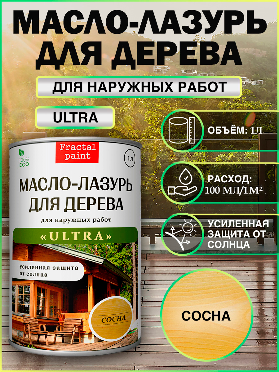 Пропитка для дерева «Масло-лазурь «УЛЬТРА» предназначена для наружных работ. Разработана для быстрой и эффективной защиты древесины от грибка, воды и ультрафиолета. Содержит натуральное льняное масло, воск, противогрибковые добавки, а также пигменты и специальные вещества для защиты от ультрафиолета. Масло подчеркивает красоту натурального дерева, проявляет текстуру и усиливает рисунок древесины. Воск защищает деревянные поверхности от атмосферных воздействий (дождь, снег). Пигменты и агенты  защищают от УФ-излучения. Специальные невымываемые водой антисептики защищают древесину от гнили. Состав подходит для обработки любых пород дерева.