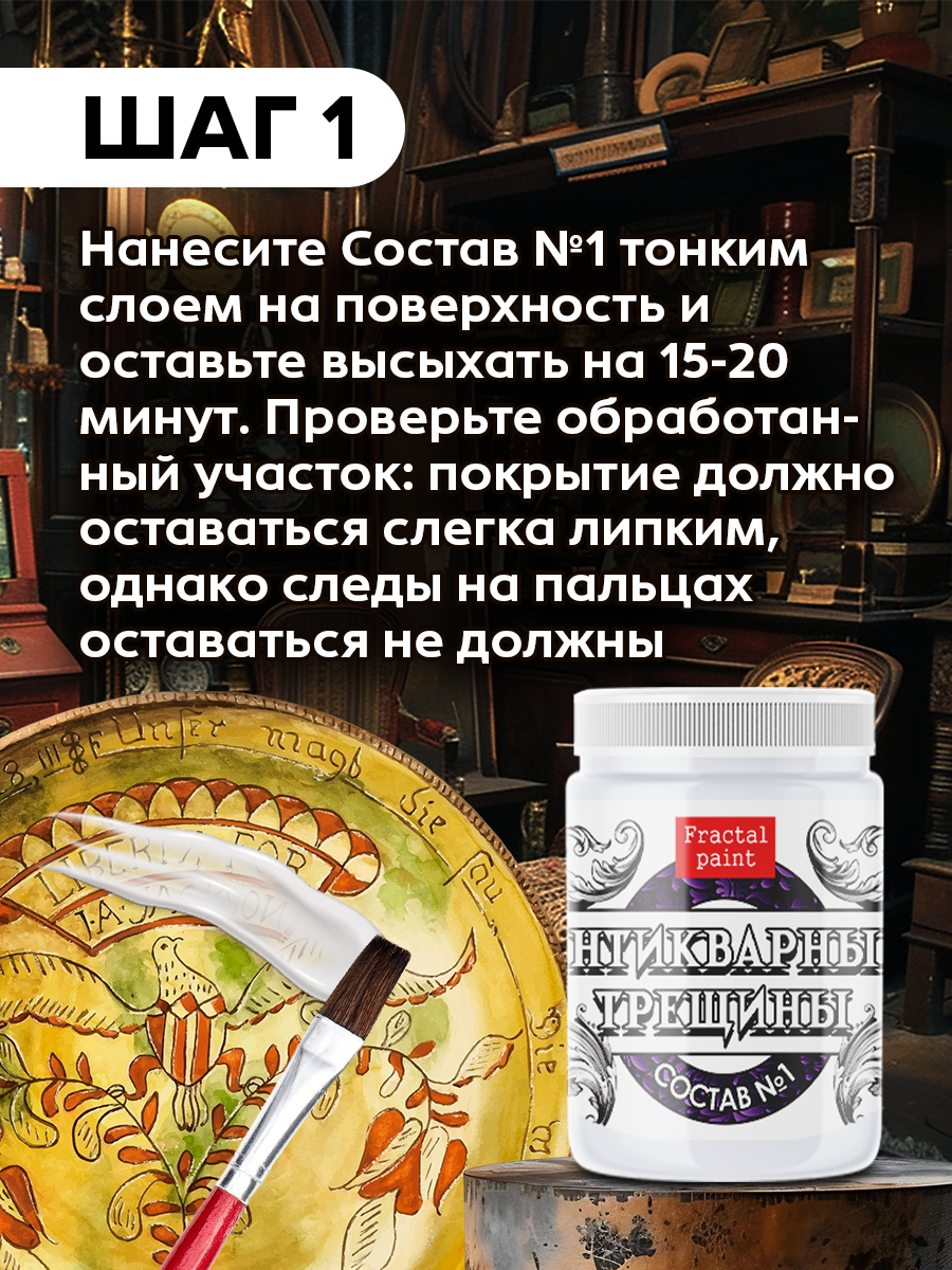 Нанесите состав №1 тонким, равномерным слоем. Можно использовать синтетическую кисть. Избегайте подтеков и слишком толстых участков. Оставьте сохнуть при комнатной температуре на 15-20 минут. ВАЖНО: Не используйте фен для ускорения процесса!