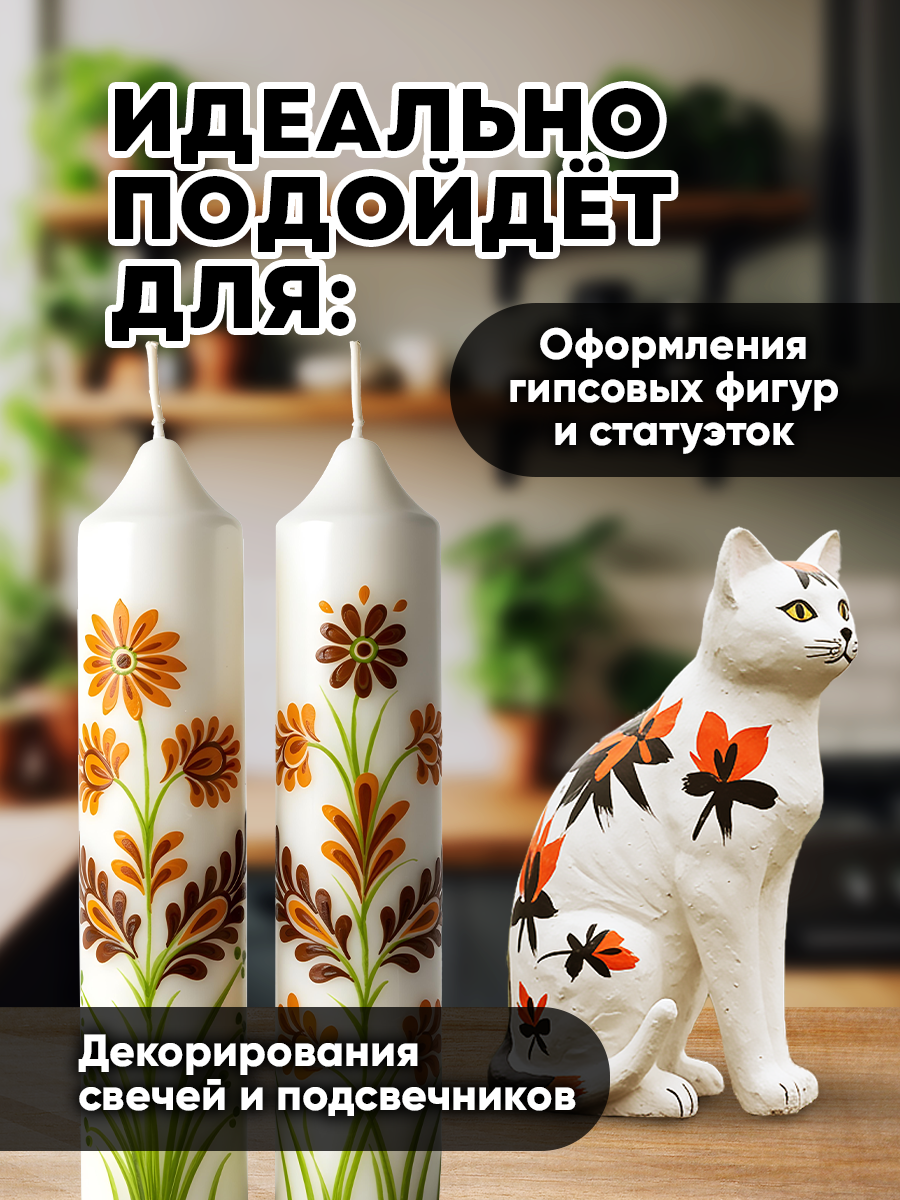 - Простота нанесения краски на гипс и свечи: легко распределяется по поверхности свечи или гипсовой формы, обеспечивая равномерное покрытие.