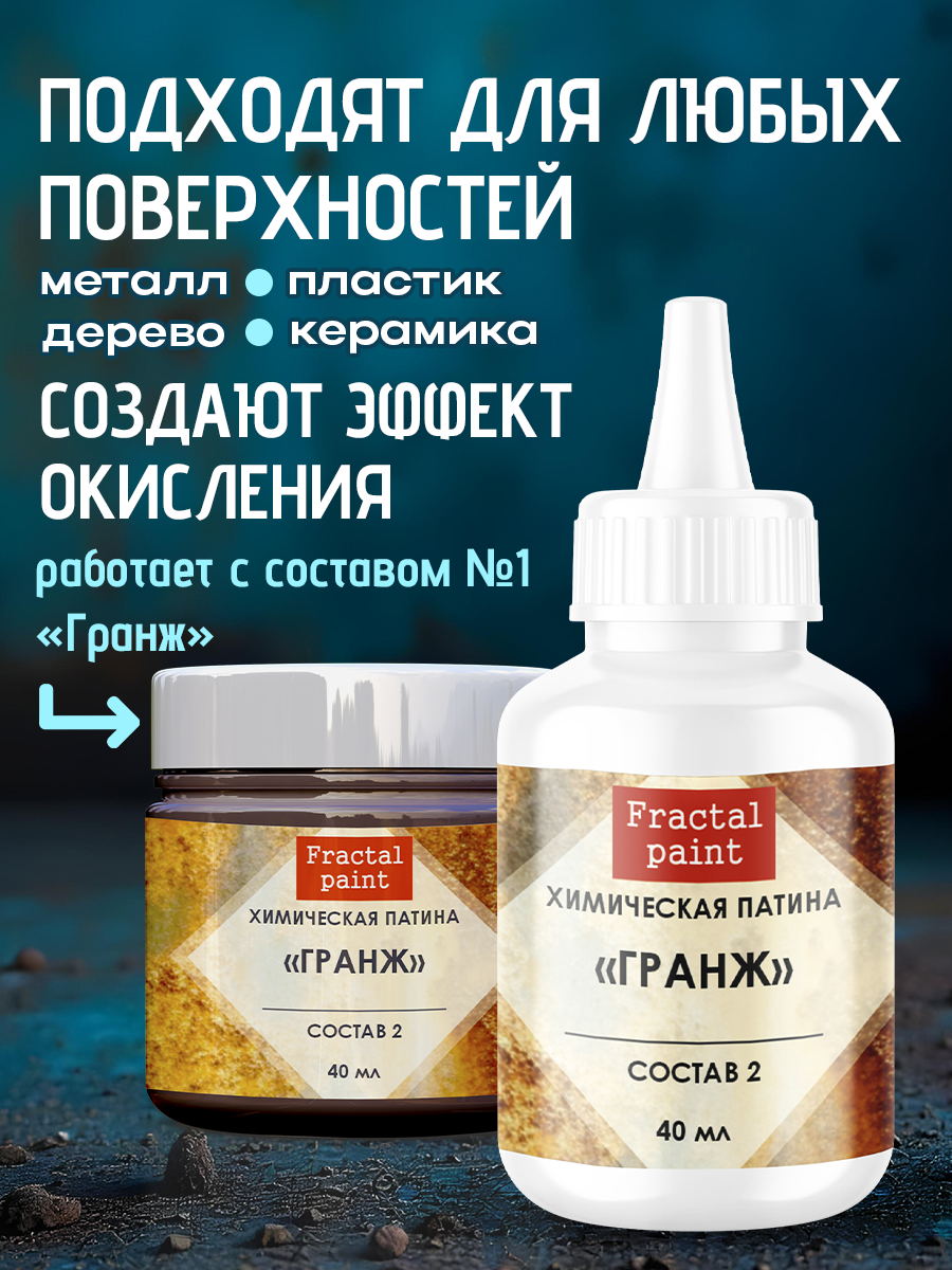 Химическая патина «Гранж» позволяет создавать красивые подтеки ржавчины в стиле ЛОФТ и ГРАНЖ, создавать пятна ржавчины под слоем краски, воспроизвести имитацию коррозии железа. Состав №2 применяется как окислитель для Состава №1. Подходит для использования на различных поверхностях (металле, дереве, пластике, керамике).
