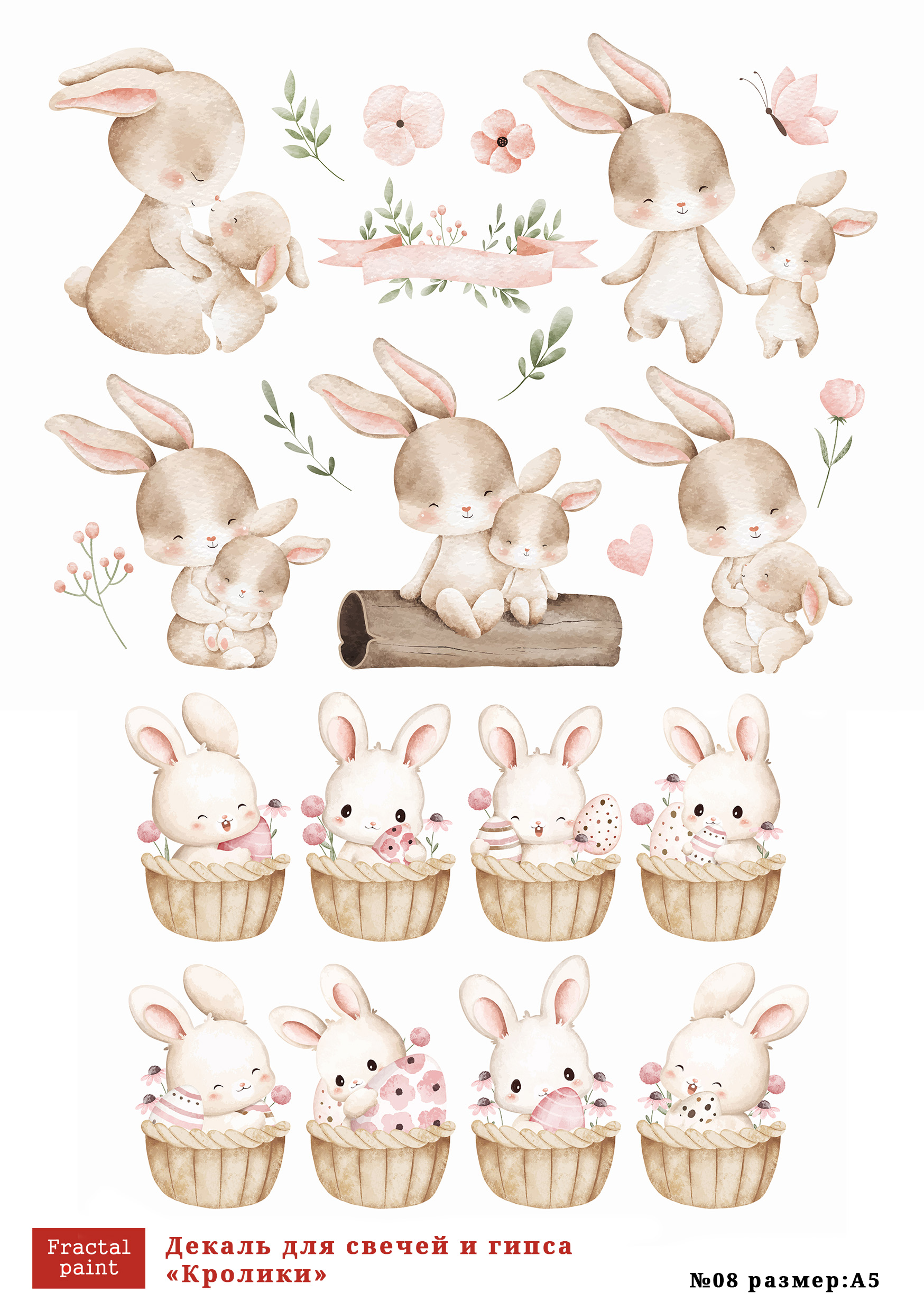 Трансфер переводной - декаль для свечей и гипса кролики 008 А5