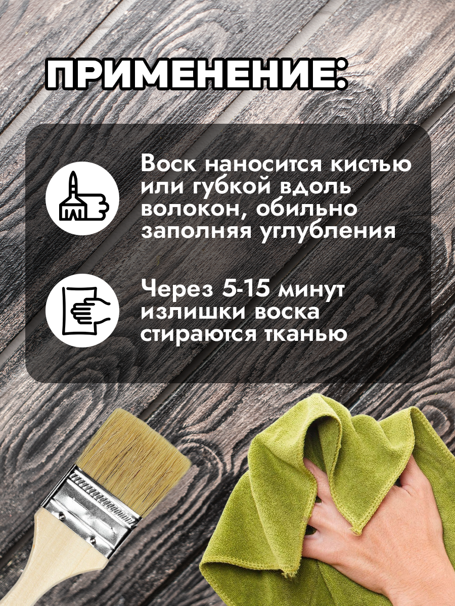Нанесение: воск наносится кистью или губкой вдоль волокон, обильно заполняя углубления. Через 5-15 минут излишки воска с гладких поверхностей аккуратно стираются тканью.